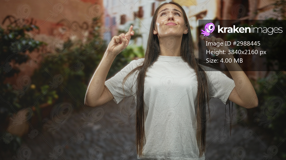 Teen girl with braces presses hands together in prayer on a narrow cobblestone street, later crossing fingers in a hopeful plea; hopeful longing.