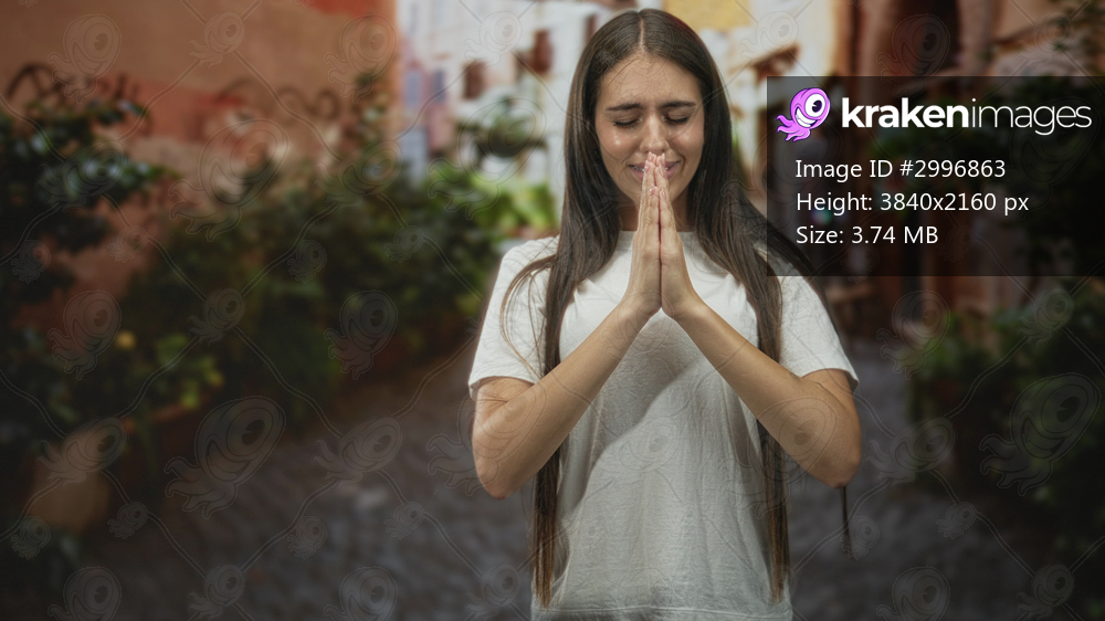 Teen girl with braces presses hands together in prayer on a narrow cobblestone street, later crossing fingers in a hopeful plea; hopeful longing.