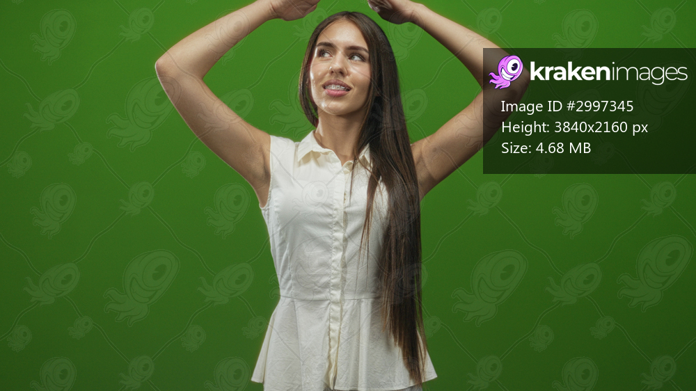 Teen girl with braces raises arms above head smiling against a green studio backdrop; youthful joy.
