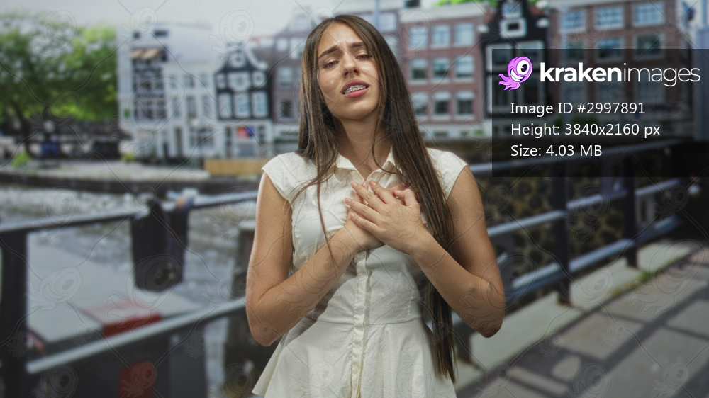 Teen girl clutching chest with hands over heart on canal street, white dress and dental braces visible, distressed expression; sadness longing.