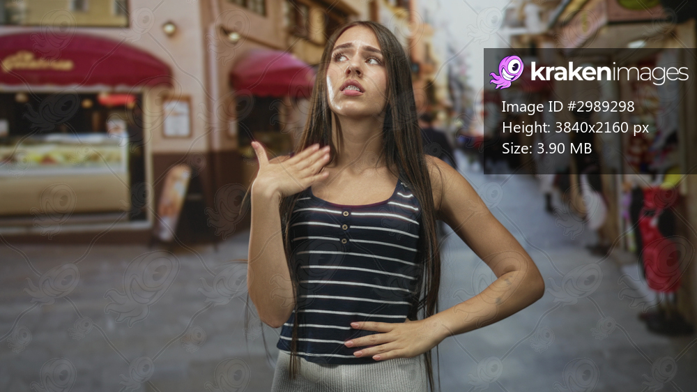 Teen girl hand near lips gesture on narrow street market, hand on hip, striped tank top and long hair visible; indifference.