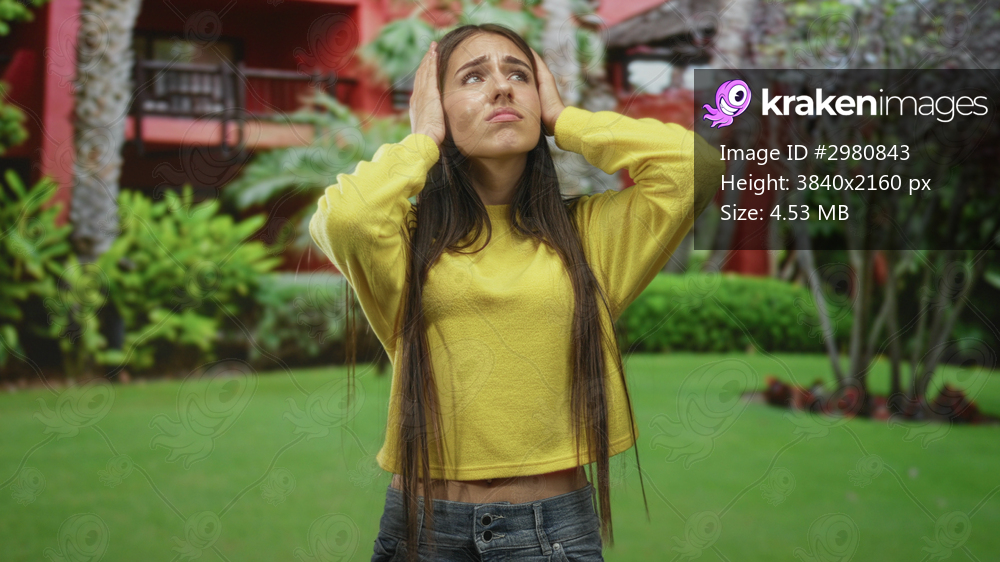 Teen girl holding hands over ears, long hair and yellow sweater in front of a red building on green lawn; loud noise distress.