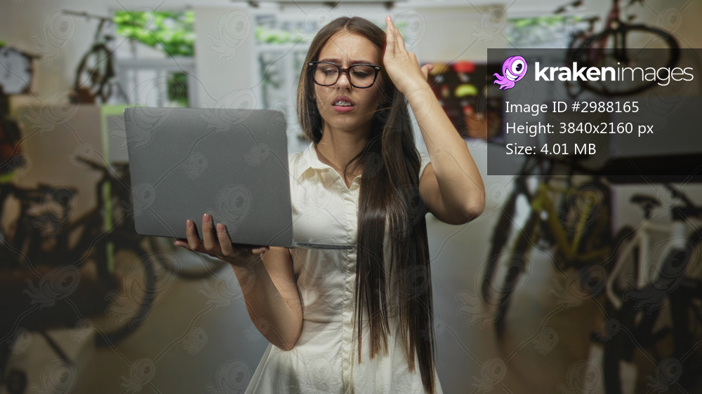 Teen girl holding laptop with one hand and hand on forehead, furrowed brow while typing in a bike shop building; frustration puzzlement.