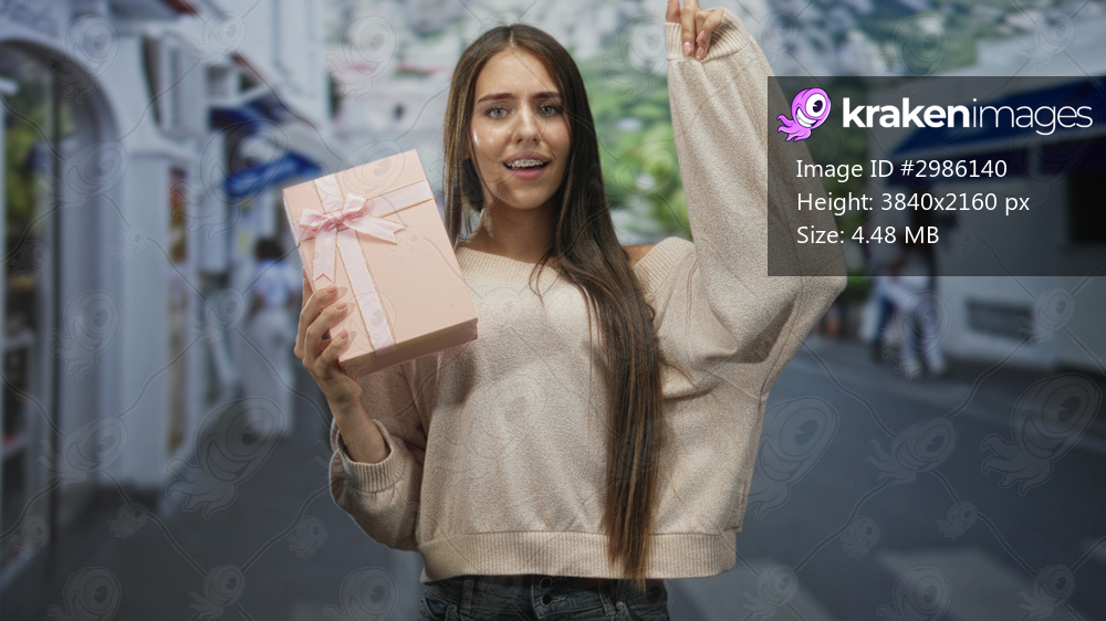 Teen girl holding pink gift box with ribbon, right arm raised waving, open mouth expression in a street; celebration joy.