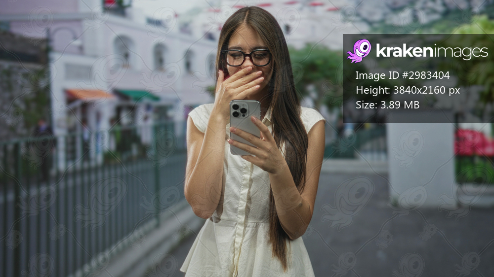 Teen girl holding smartphone taking a selfie, smiling with braces by an iron railing on a street; youthful joy.