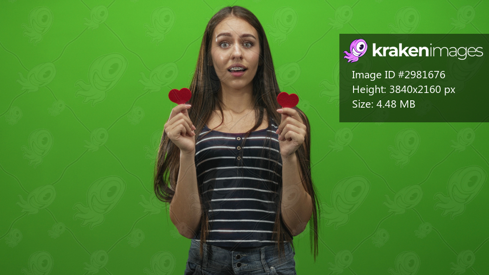 Teen girl holding two red hearts with hands, smiling with braces in a green studio; young love happiness.