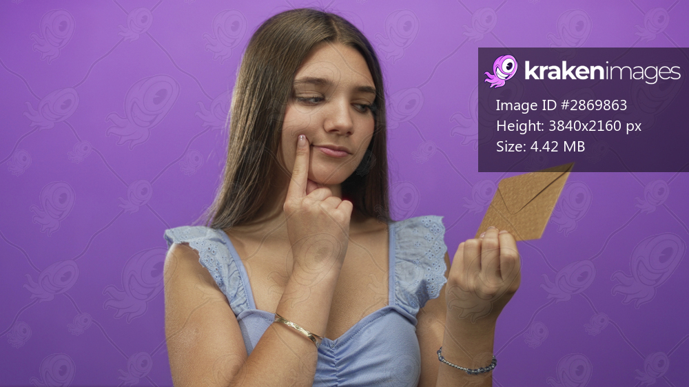 Teen girl holds envelope and points finger to cheek with subtle smile in softly lit purple studio; curiosity.