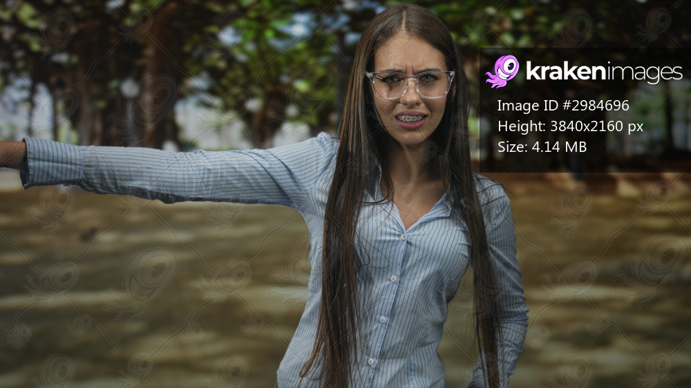 Teen girl in forest wearing clear glasses extends arm and makes a disgusted grimace while standing in striped shirt; annoyance defiance.