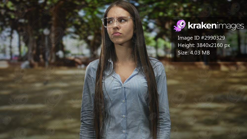Teen girl in forest wearing clear glasses extends arm and makes a disgusted grimace while standing in striped shirt; annoyance defiance.