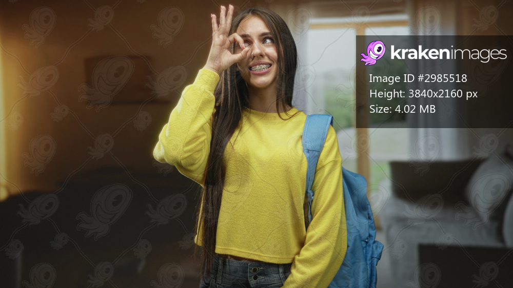Teen girl in yellow sweater and blue backpack smiles with braces while making an ok hand sign over her eye in a sunlit building living room with window and couch; playful. - Kraken Images
