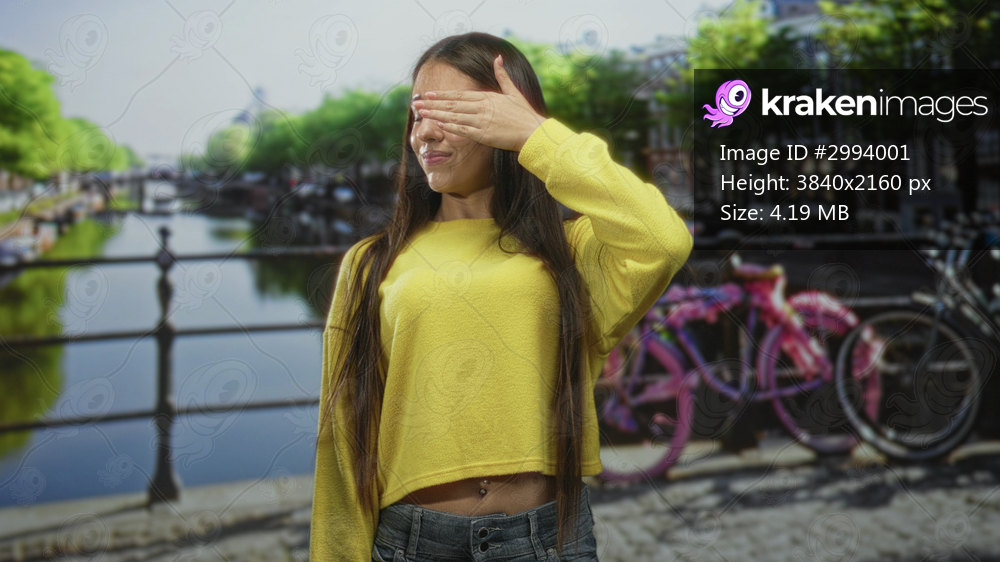Teen girl in yellow sweater covers eyes with hand, exposed navel and long hair, standing by canal railing with parked bicycles on street; playful.