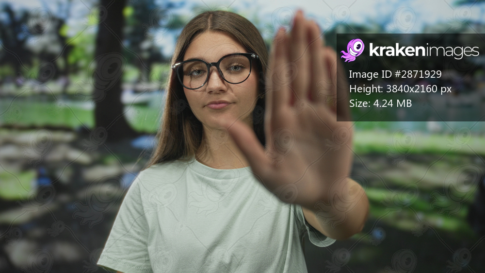Teen girl with long brown hair in white tee and glasses holds up palm in green park by sunlit pond; defiance.