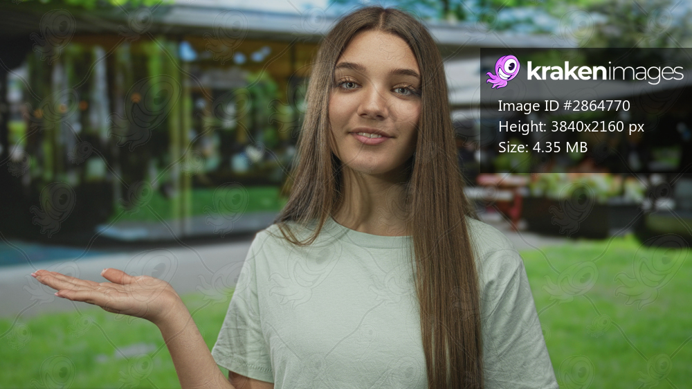 Teen girl with long hair holds open palm near building on green grass under sunlight with subtle smile; serenity.