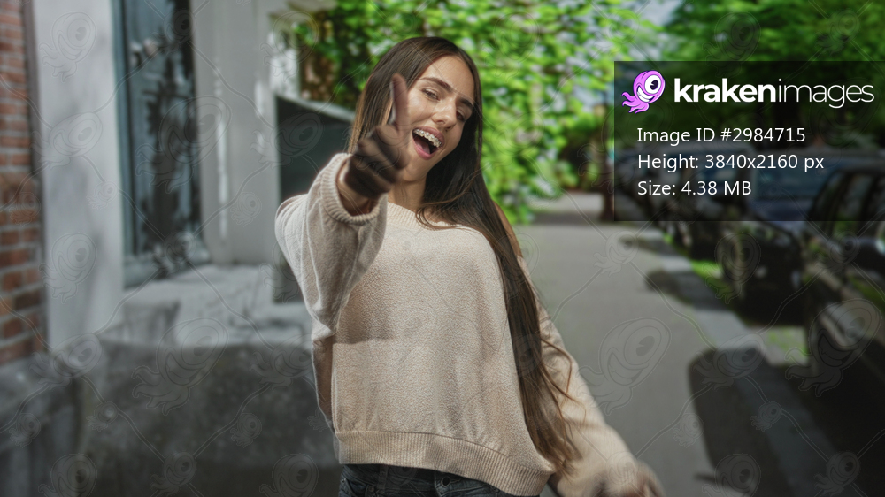 Teen girl with long hair and off shoulder sweater points finger at camera on a tree lined urban street beside parked cars and brick building; playful confidence. - Kraken Images