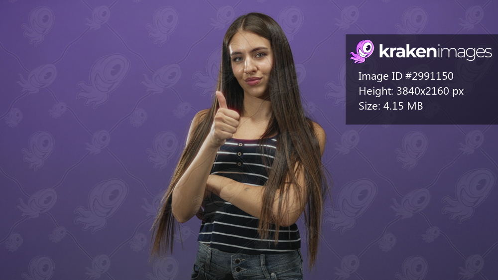Teen girl with long hair wearing a striped tanktop and jeans shows thumbs up with crossed arms in studio purple backdrop, facing camera; confidence.