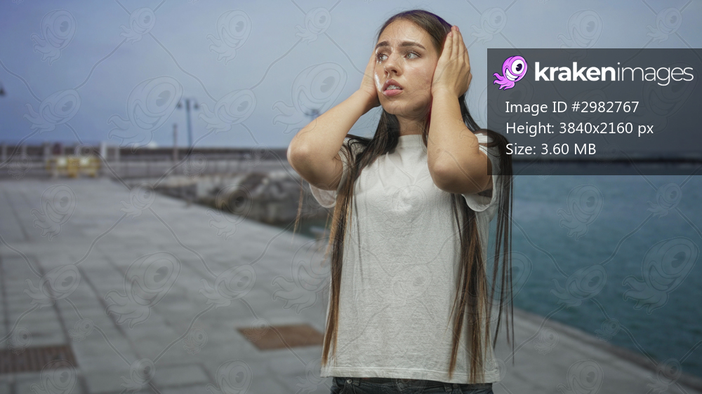 Teen girl pressing hands to ears and grimacing on a street pier with long hair and white tshirt; anxiety.