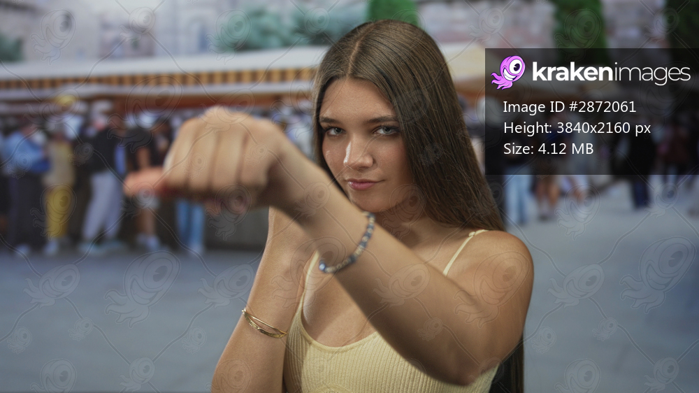 Teen girl raising fists and flexing arms before a crowded outdoor street market stall during daytime; confidence.