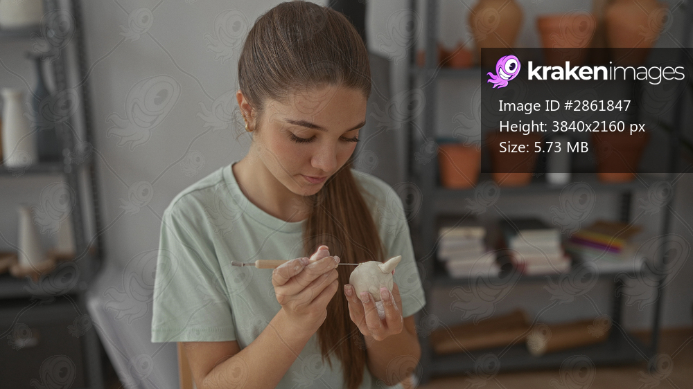 Teen girl sculpts a horned clay pot with carving tool and bare hands in a bright studio; quiet concentration.