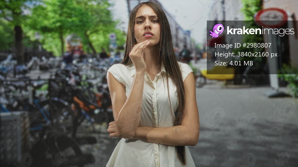 Teen girl standing with folded arms and hand to chin near a crowded bicycle rack on a busy city street; contemplation decision.