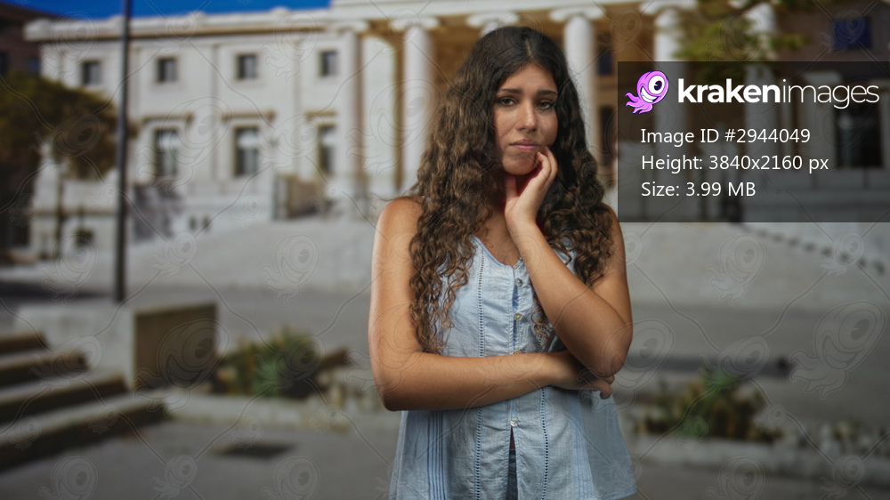 Teen girl touching her face with hands, arms crossed while standing before a neoclassical courthouse building; uncertainty introspection.