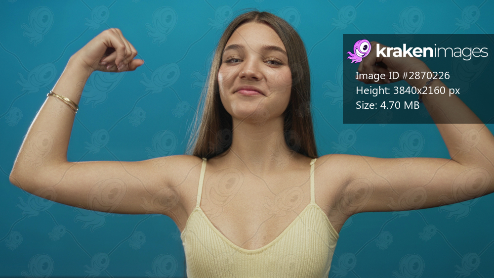 Teen girl wearing beige tank top flexes biceps in bright studio with blue wall; confidence empowerment strength.
