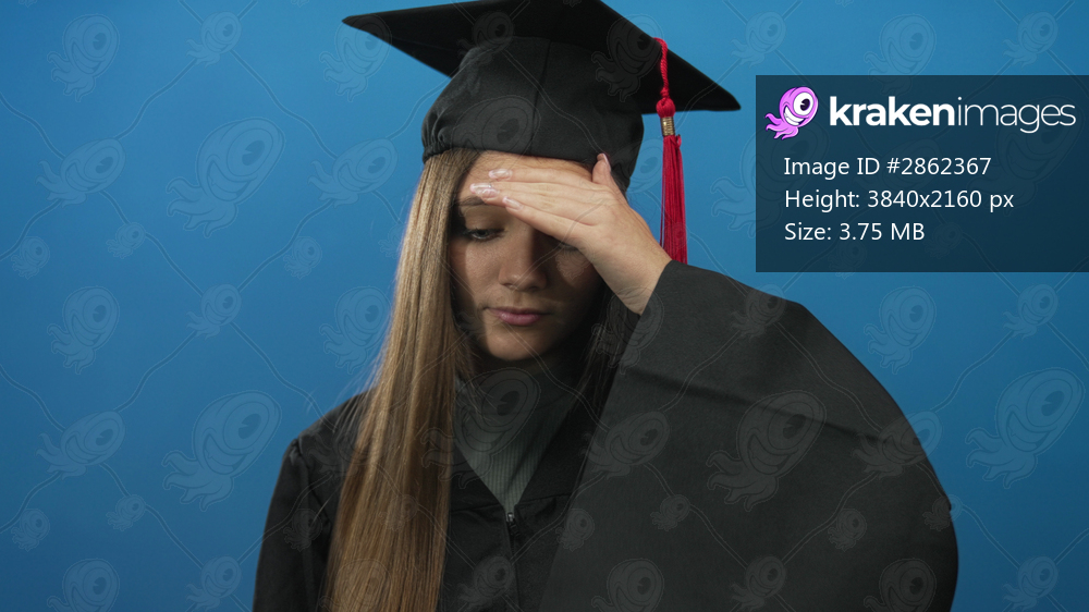 Teen girl wearing mortarboard and graduation gown holds hand on forehead in blue studio; uncertainty doubt reflection hesitation.
