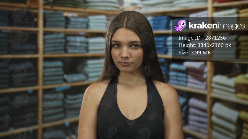 Teen girl wears black tank top and looks into camera amid stacked sweaters in clothing shop; confidence.