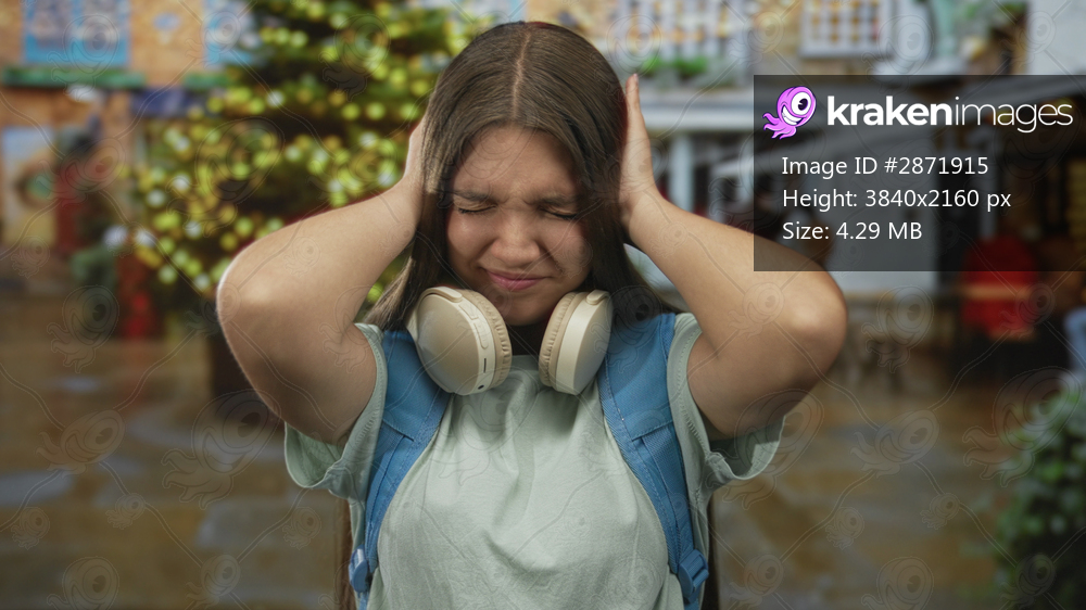 Teen girl with white headphones and blue backpack covers ears on holiday street beside decorated tree; stress frustration.