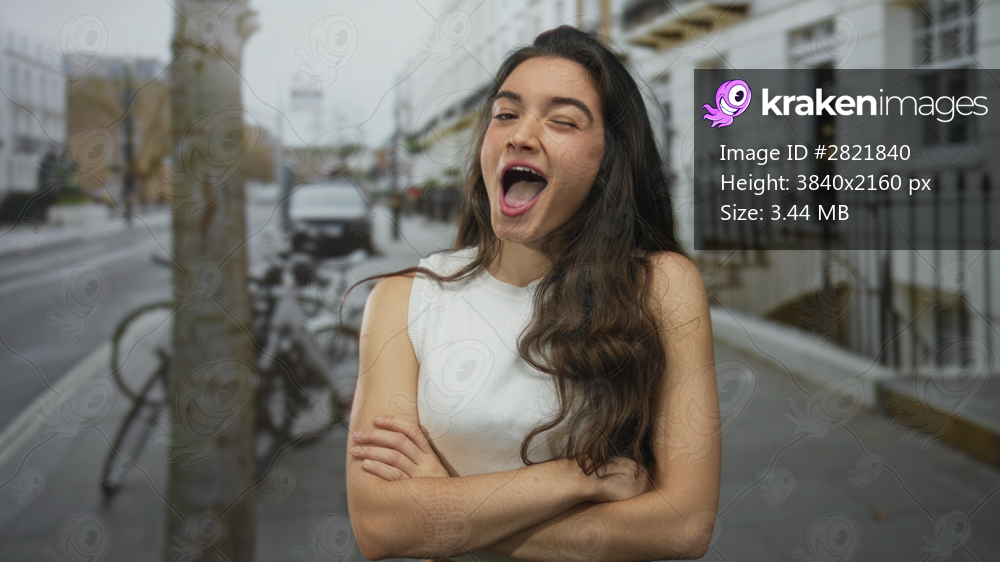 Teen hispanic woman with long hair wearing a white tank top winking with crossed arms on a bustling street; confidence.