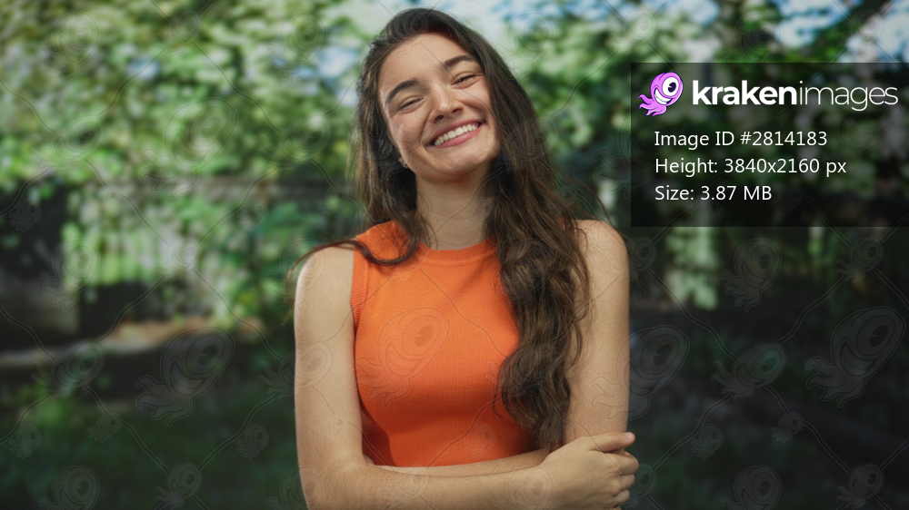 Teen hispanic woman wearing orange tank top with long wavy hair and arms crossed smiling in lush green park; carefree joy.