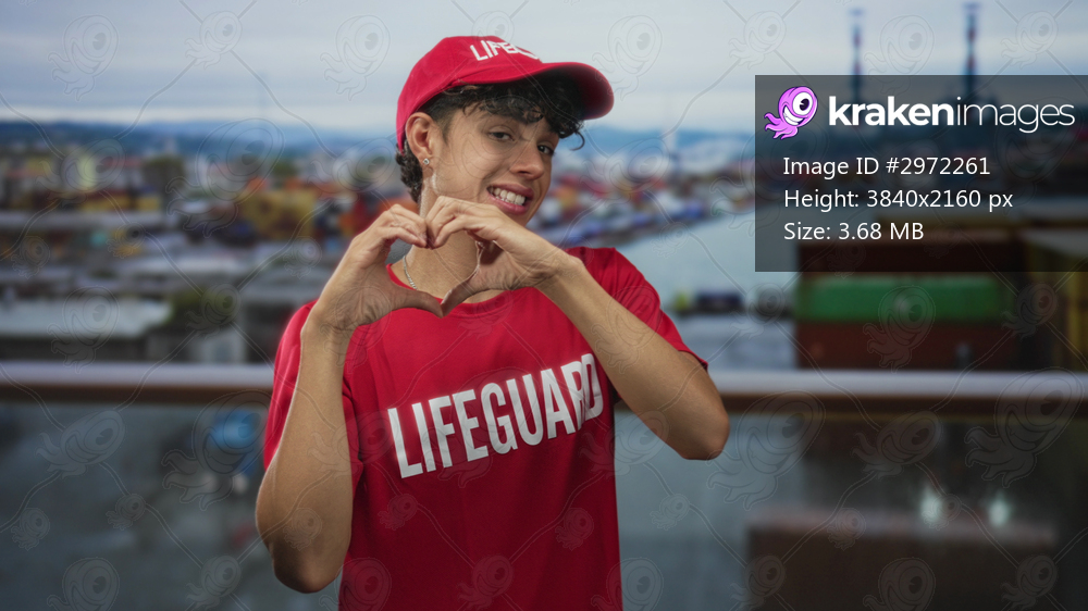 Teen lifeguard boy forming heart with hands gesture on port walkway with shipping containers and cranes; youthful joy.
