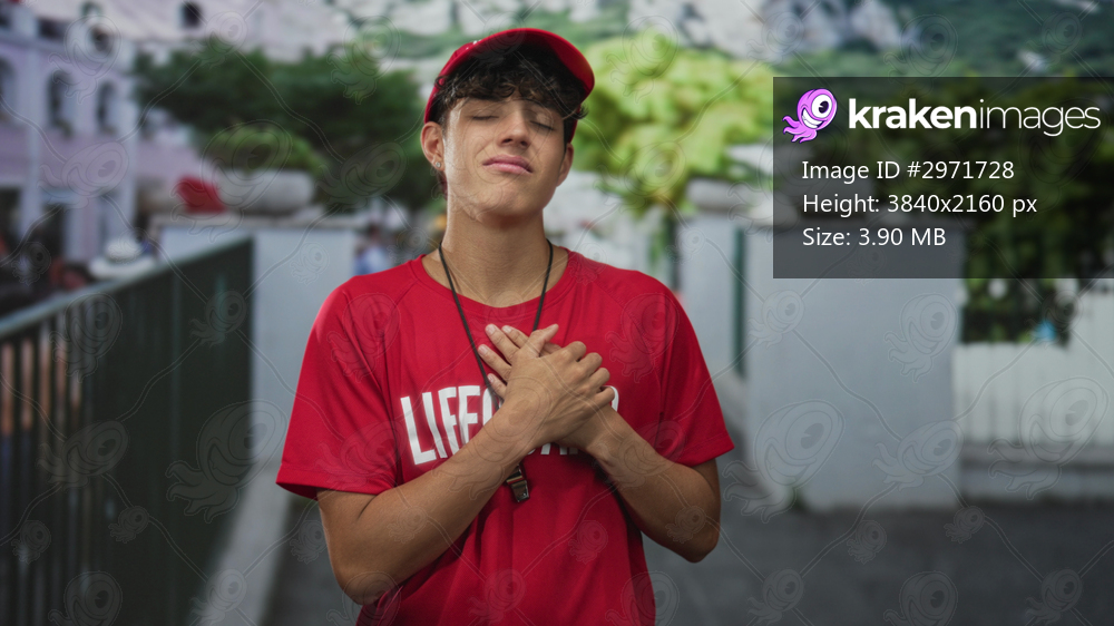 Teen lifeguard forming heart with hands wearing red shirt and whistle by a building promenade; compassion duty.