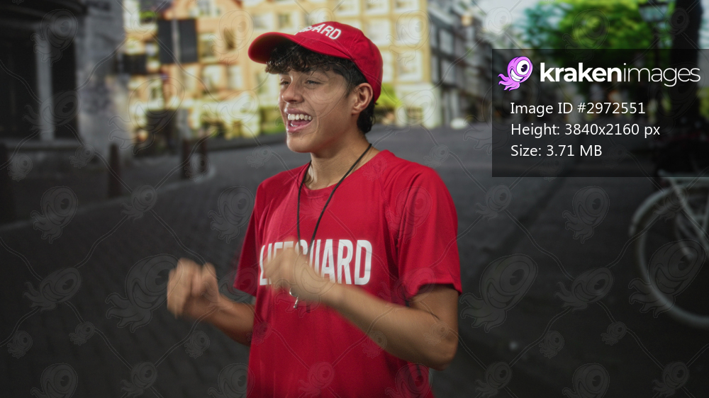 Teen lifeguard man clenches fists and grins, whistle on cord at chest, red cap and shirt visible, standing on cobblestone street with bicycle at curb; joy youthful victory. - Kraken Images