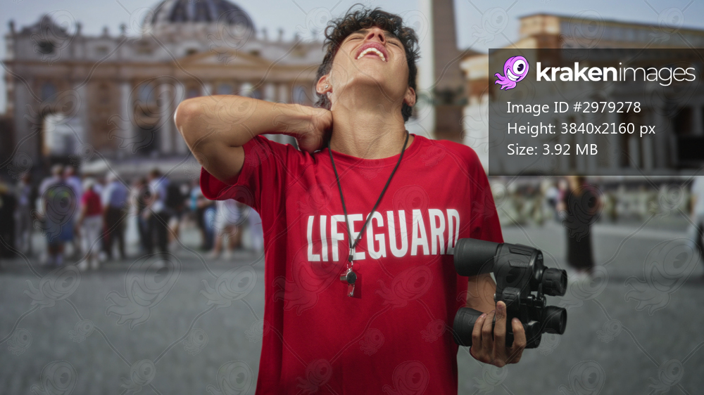 Teen male lifeguard in red shirt touching neck and holding binoculars near historic building plaza crowded with tourists; discomfort.