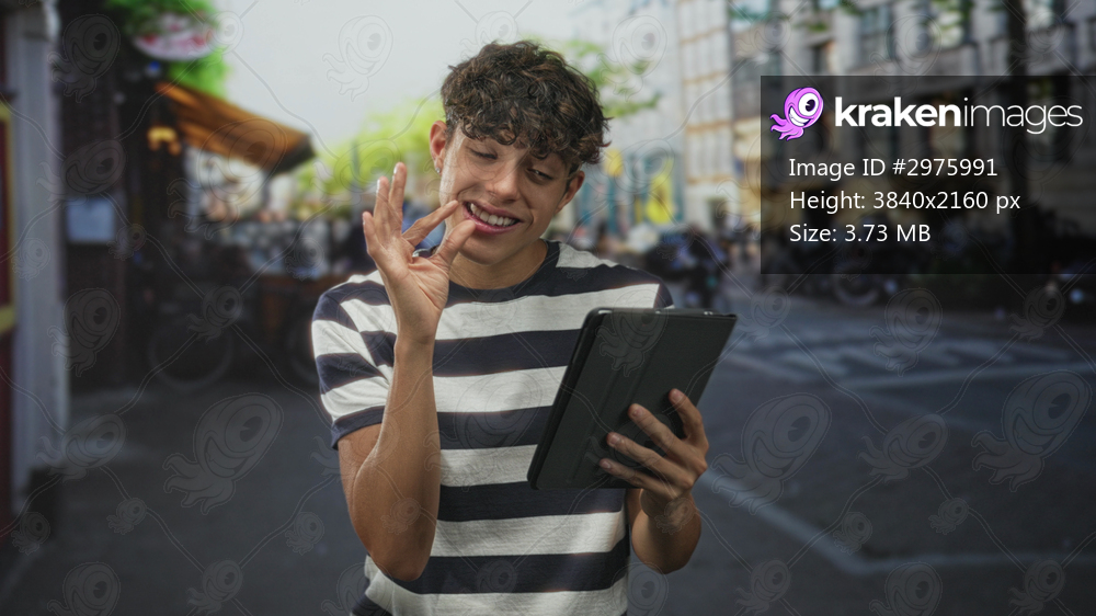 Teen man in striped shirt holding tablet and making ok gesture on a busy street cafe, smiling and reading from screen; joy curiosity.