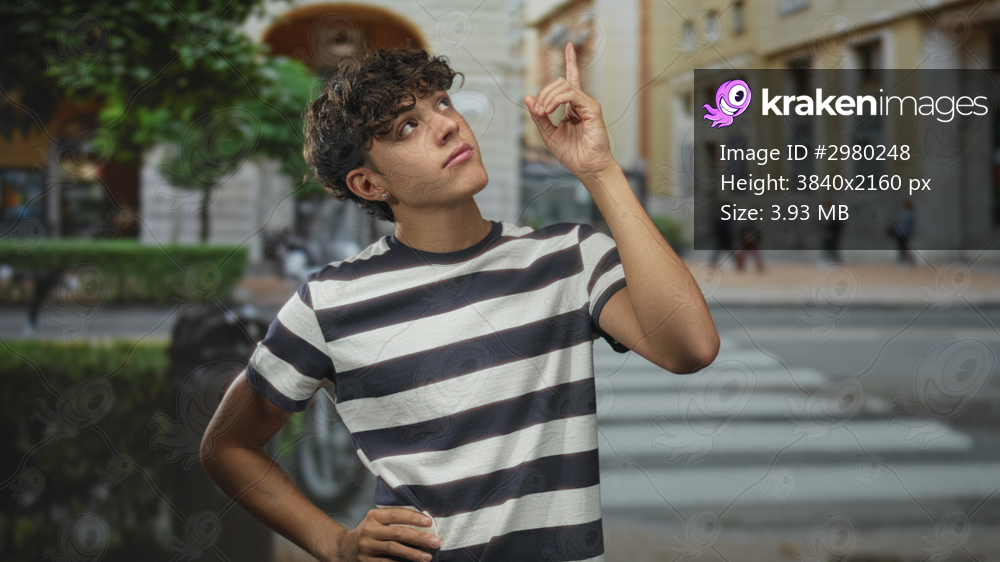 Teen man touching finger to lips for silence on a city street by a crosswalk, arms crossed and eyes closed; thoughtful silence.