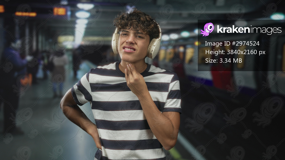 Teen man wearing headphones touches throat with hand on hip on subway platform inside station building; urban commute annoyance.
