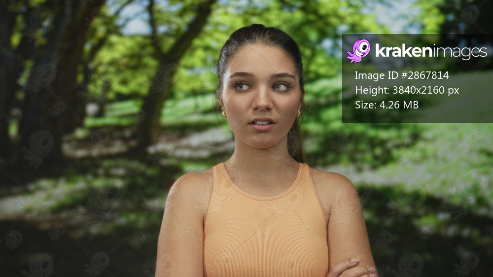 Teen woman frowning with folded arms and pensive gaze while standing in sunlit lush green park; defiance.