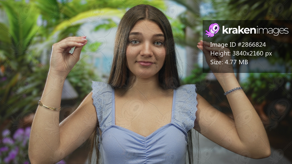 Teen woman gesturing with hands in forest path among plants and flowers, hands raised at chest level; playful curiosity.