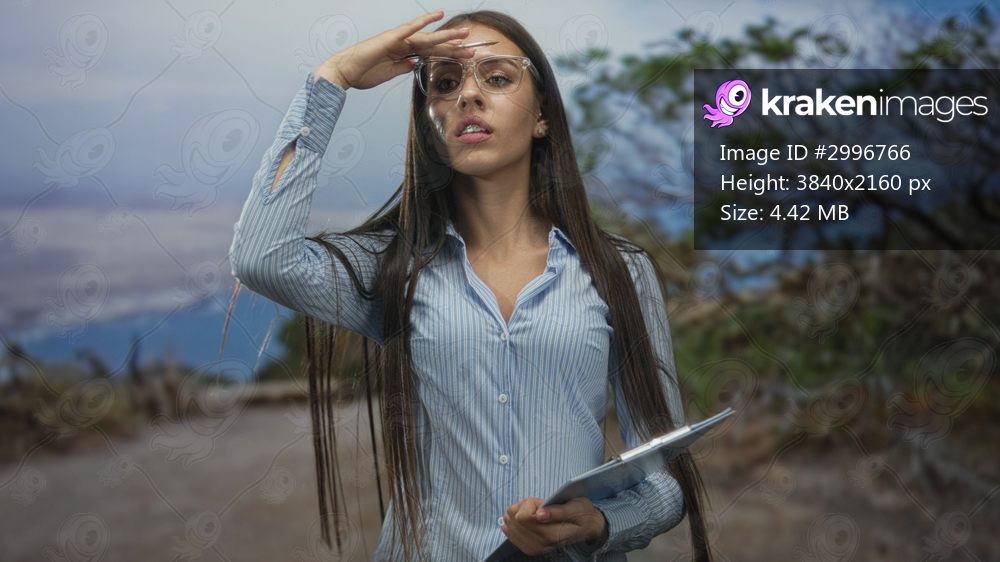 Teen woman holding clipboard with hand shading eyes on coastal overlook trail, wearing glasses and striped shirt; quiet contemplation.