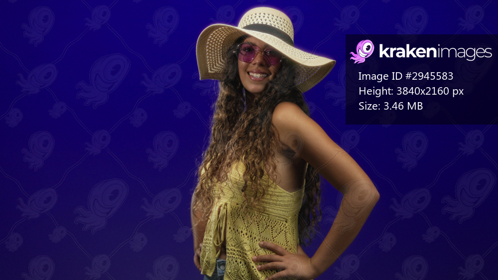 Teen woman in yellow crochet top wearing straw sunhat and pink sunglasses smiles with hands on hips in a studio with blue backdrop; joy confidence.