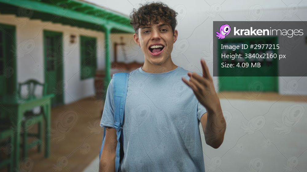 Teenage boy with backpack flashing rock horns, hands raised and tongue out in building courtyard near green door; playful rebellion.