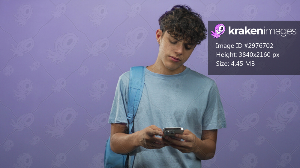 Teenage boy with backpack wearing blue t shirt holding smartphone and texting, looking down with hands visible in studio; pensive solitude.