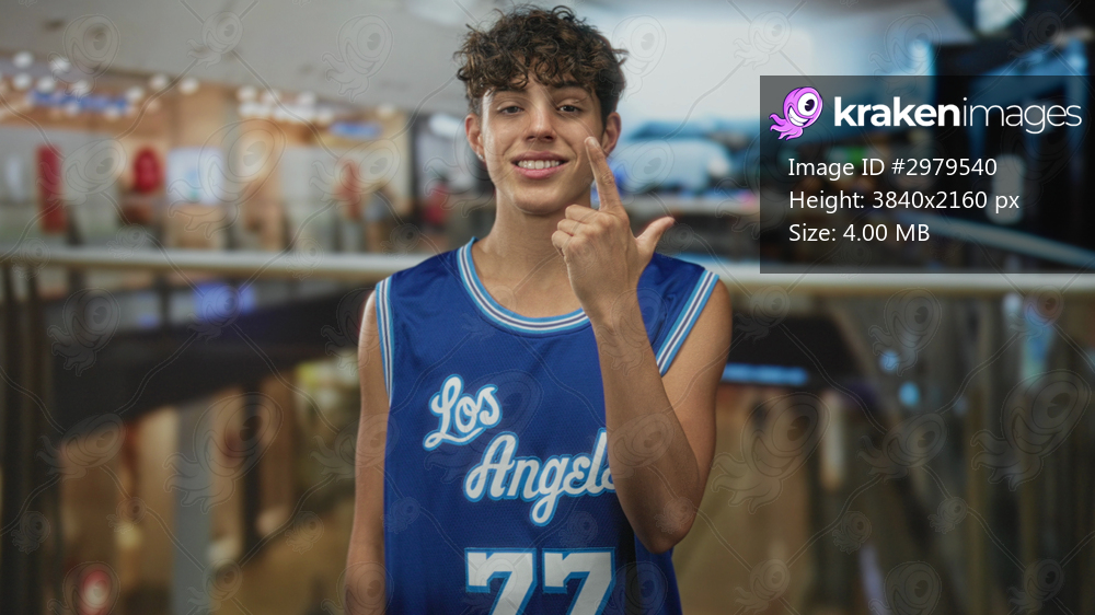 Teenage boy with bare thumb giving a thumbs up wearing a los angeles basketball jersey in a building; confidence youth energy.