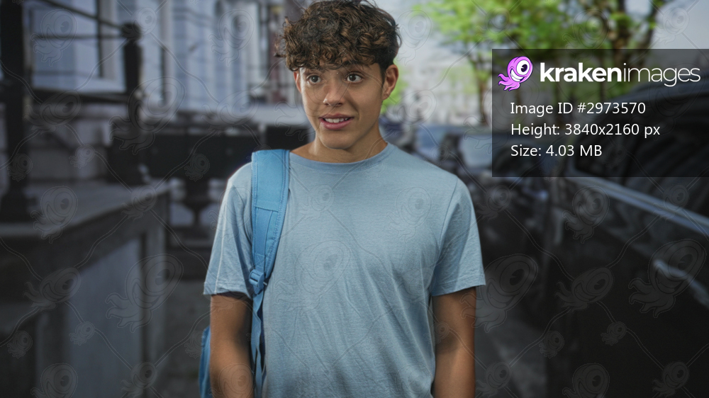 Teenage boy with blue backpack stands looking at camera, one hand on shoulder strap on a city street; curiosity.
