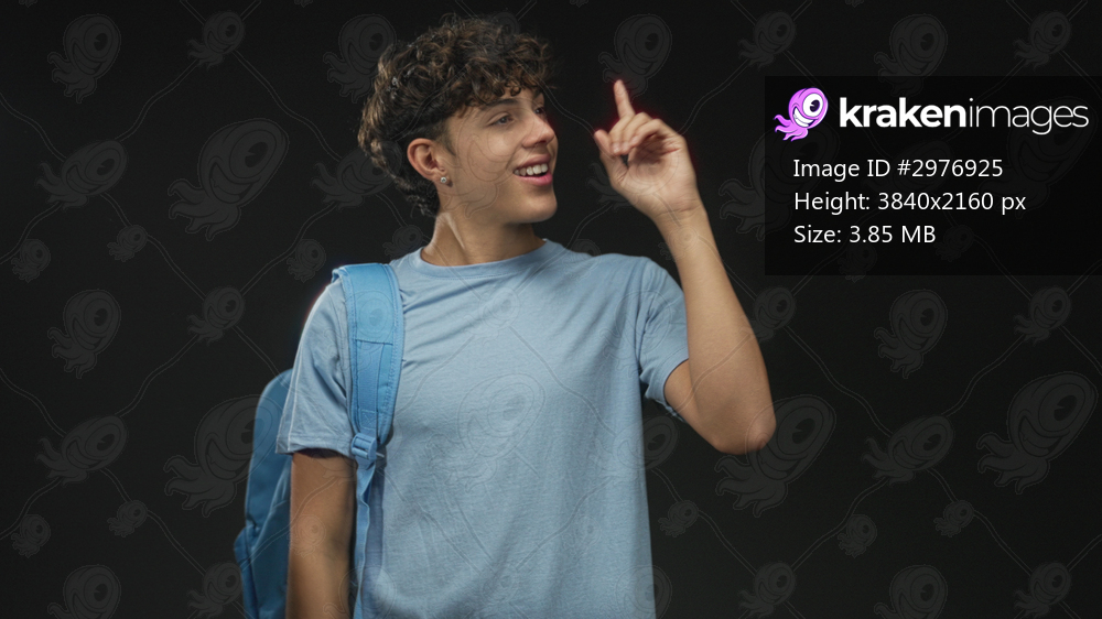 Teenage boy with blue backpack touching chin and pointing finger upward in studio; curiosity playful.
