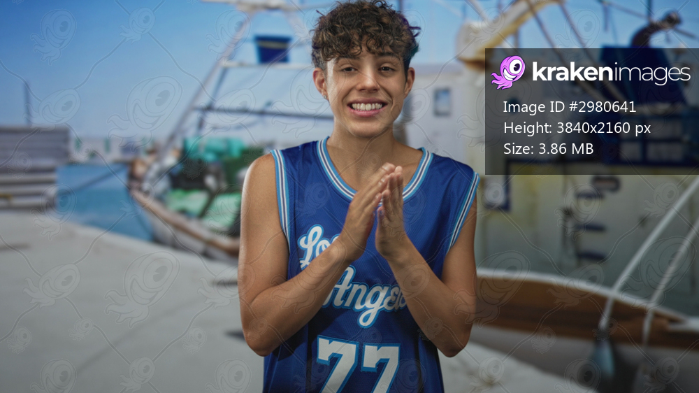 Teenage boy claps hands wearing blue basketball jersey number 77 in studio marina backdrop, smiling and facing camera; playful excitement.