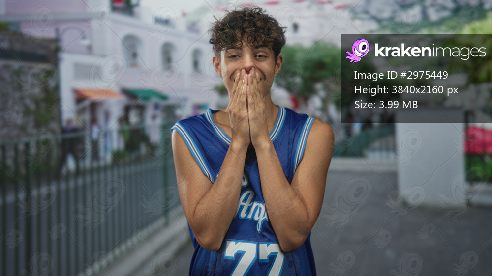Teenage boy covers mouth with hand in blue basketball jersey 77 on a street with buildings and railings; playful youth energy.