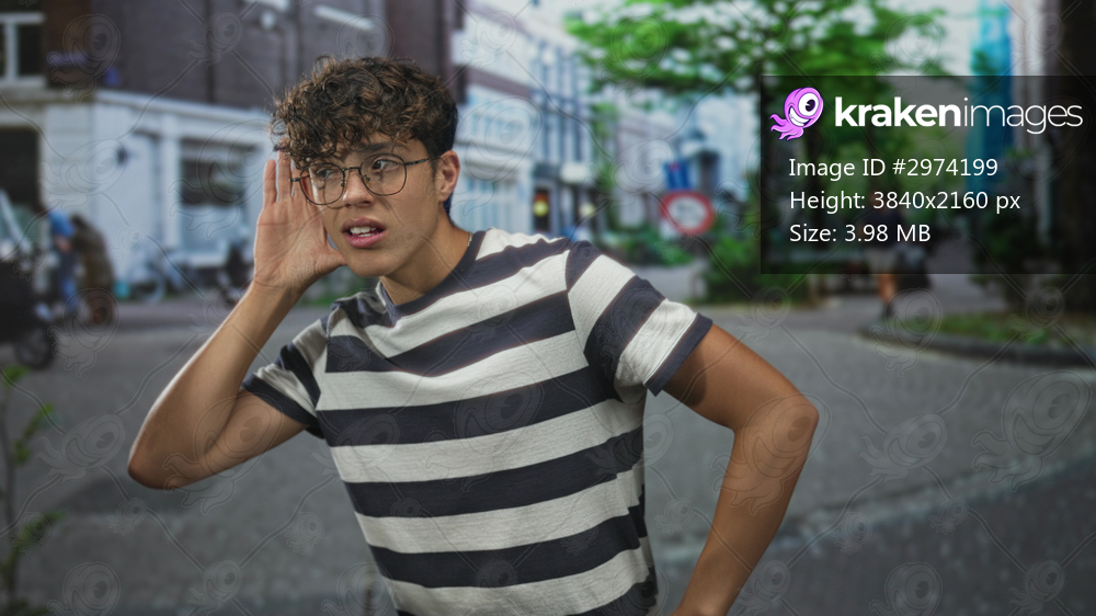 Teenage boy cupping his ear with hand, wearing glasses and black and white striped shirt on a busy city street near parked scooter; curiosity.