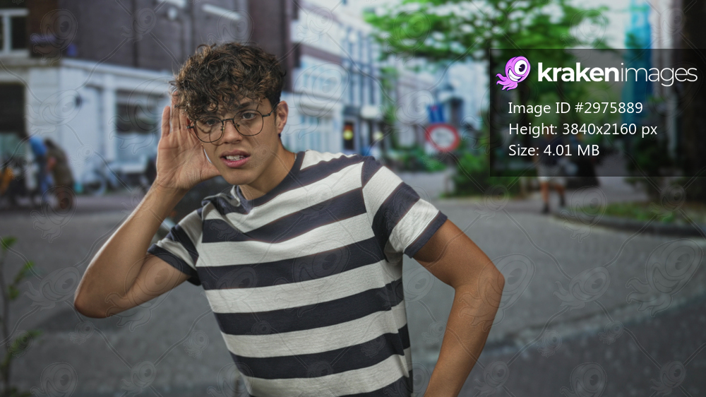 Teenage boy cupping his ear with hand, wearing glasses and black and white striped shirt on a busy city street near parked scooter; curiosity.